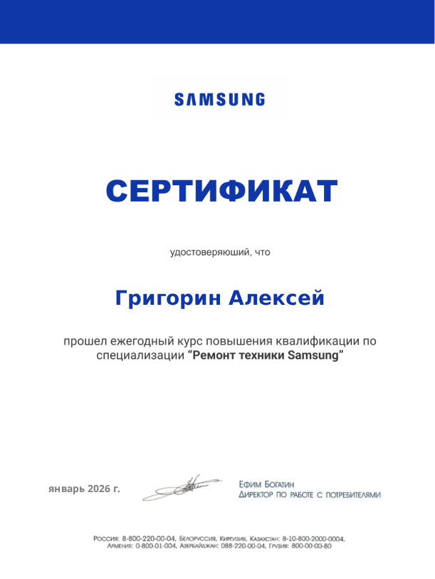 Всем привет! Я Григорий, много лет паял платы и занимался ремонтом радиотехники, пока меня не пригласили в Центральный СЦ Самсунга. Здесь прошел переобучение, подтвердил квалификацию и теперь занимаюсь компьютерным железом. Работа сложная, но всё делаю на совесть.